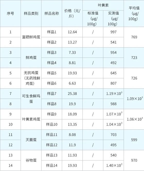 叶黄素是含氧类胡萝卜素,是一种抗氧化物,在一定程度上能帮助人体眼睛抵挡蓝光、紫外线等有害光线的侵害,从而可以达到保护视力、促进视网膜细胞再生、预防高度近视和减少眼部疾病发生的作用。14批次鸡蛋样品测试结果见表3。
