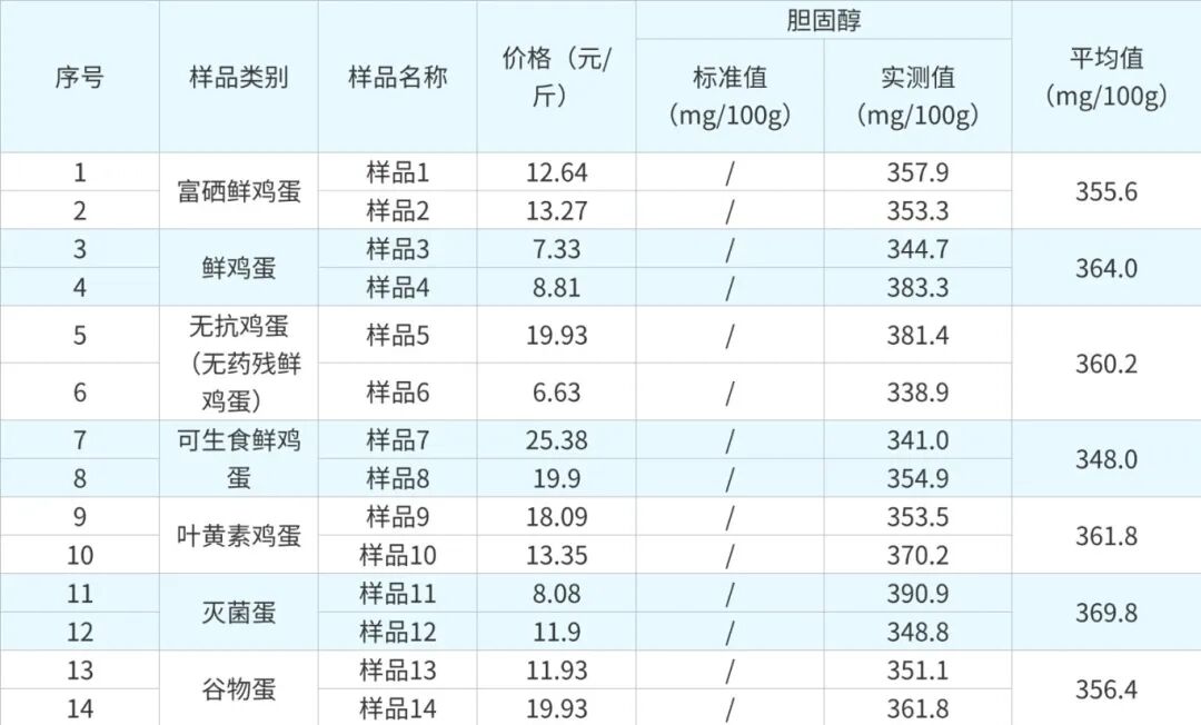 经测试,本次比较试验14批次鸡蛋样品的胆固醇含量平均值差异不大。其中,灭菌蛋胆固醇含量平均值较高,可生食鲜鸡蛋胆固醇含量平均值较低。