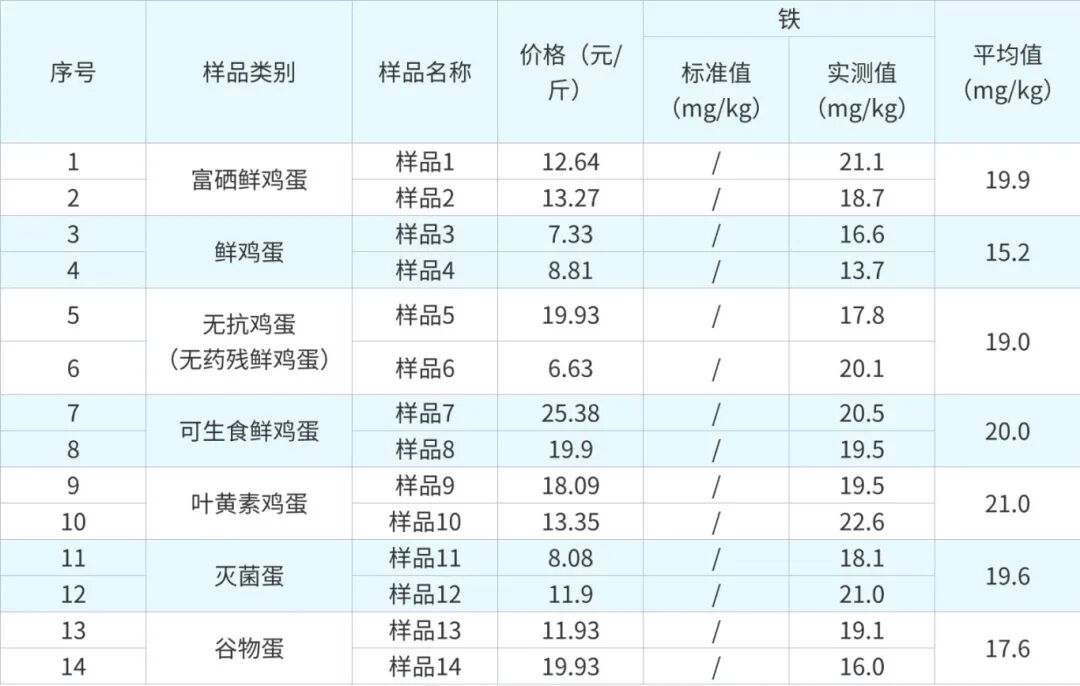 铁是动物身体组织和血液的重要组成物质。是人体中必需痕量元素中含量最高的一个,约占人体总重量的0.006%。铁在人体内主要分布于血红细胞中,约占人体总铁量的60%-70%。在铁蛋白和肌红蛋白中,铁则分别约占人体总铁量的7%-15%和3%-5%。14批次鸡蛋样品测试结果见表5。
