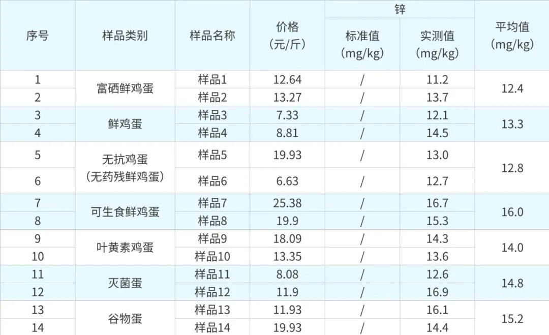 经测试,本次比较试验14批次鸡蛋样品的锌含量平均值差异不大。其中,可生食鲜鸡蛋含锌量平均值较高,富硒鸡蛋含锌量平均值较低。