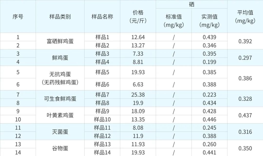 硒是人体的必需营养素之一,从膳食中摄取后主要在小肠内被吸收,在人体内与蛋白质结合为“含硒蛋白”后发挥生理作用,主要表现在抗氧化、调节甲状腺激素、维持正常免疫功能,以及预防硒缺乏相关地方病(克山病和大骨节病)等。14批次鸡蛋样品测试结果见表7。